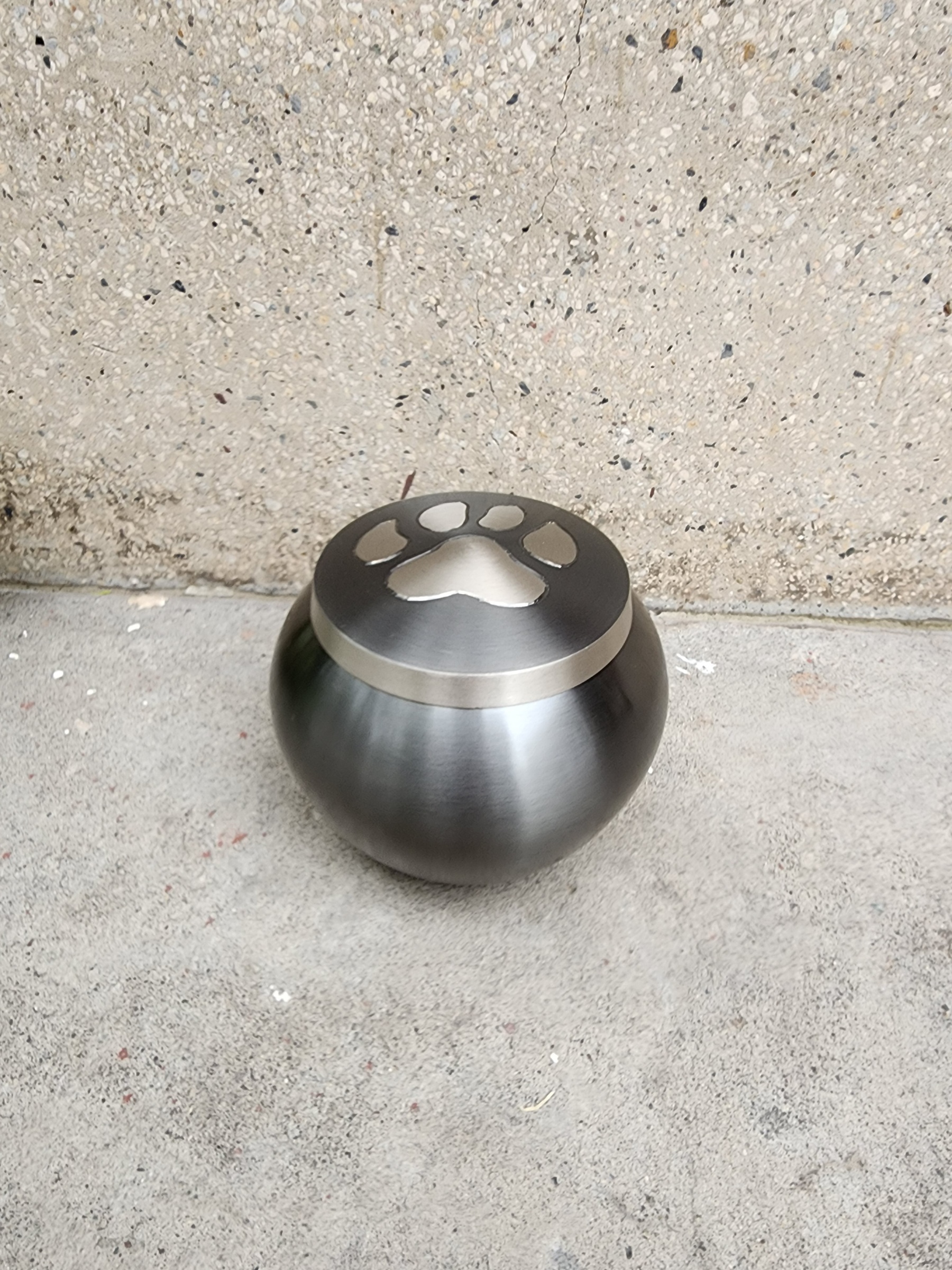 Nuestra línea Odisea es una bella alternativa para nuestras amadas mascotas. De Líneas redondeadas y simples, su forma entrega calidez y cercanía. Fabricada a mano en bronce macizo electroplatinado y terminada en color grafito, con una bella huella plateada, grabada tambien a mano, en su tapa. Este tamaño sirve para conservar las cenizas de un perro entre 32 y 55 kilos.